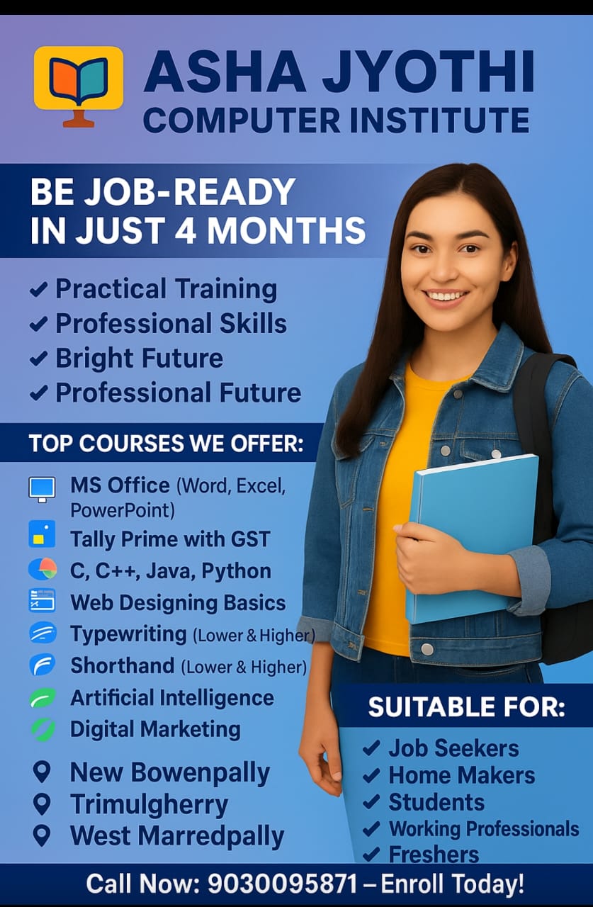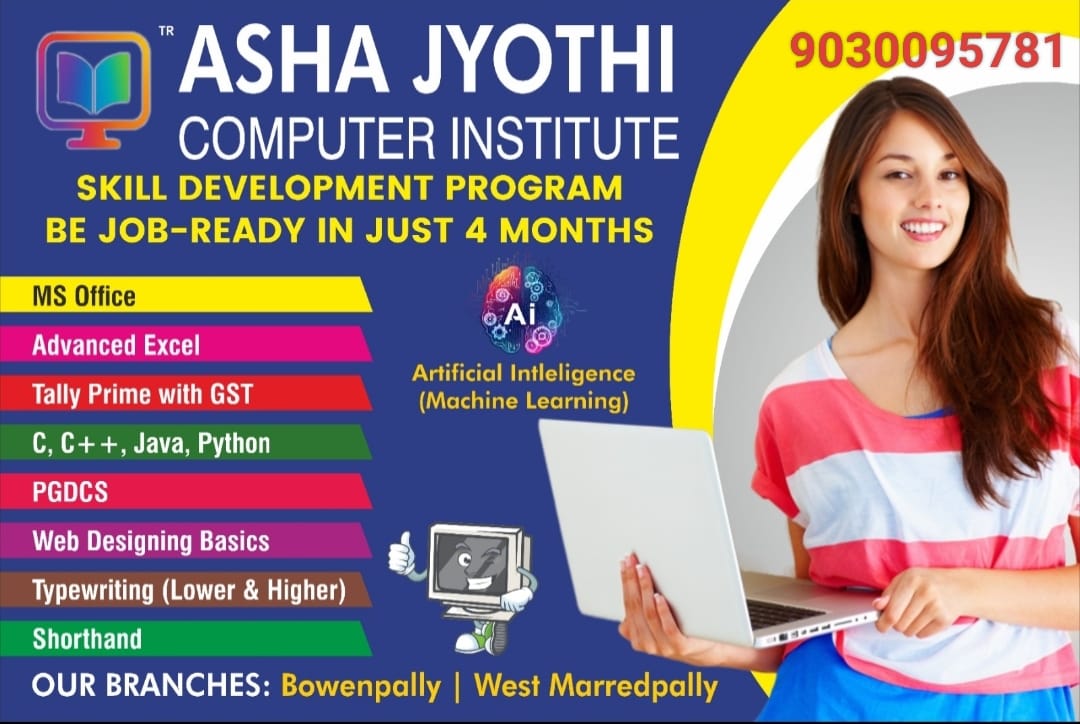 Asha Jyothi Computer & Typewriting Institute offers job-focused computer training designed to build strong practical skills for students, job seekers, and working professionals. Our computer courses focus on real-time applications that are essential for office work, government exams, corporate jobs, and day-to-day digital usage.