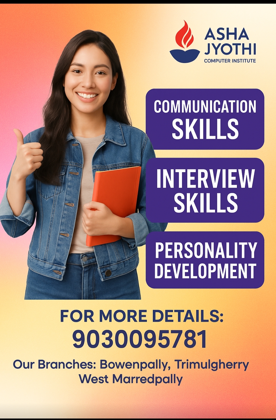 The Personality Development Course at Asha Jyothi Computer Institute is designed to help individuals build confidence, improve behavior, and develop a positive professional personality. This course focuses on self-improvement, communication, and personal grooming to succeed in academics, careers, and life.